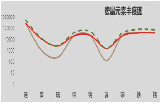 圖:灰色為地殼含量 紅色為人體血液含量 綠色為流露水含量