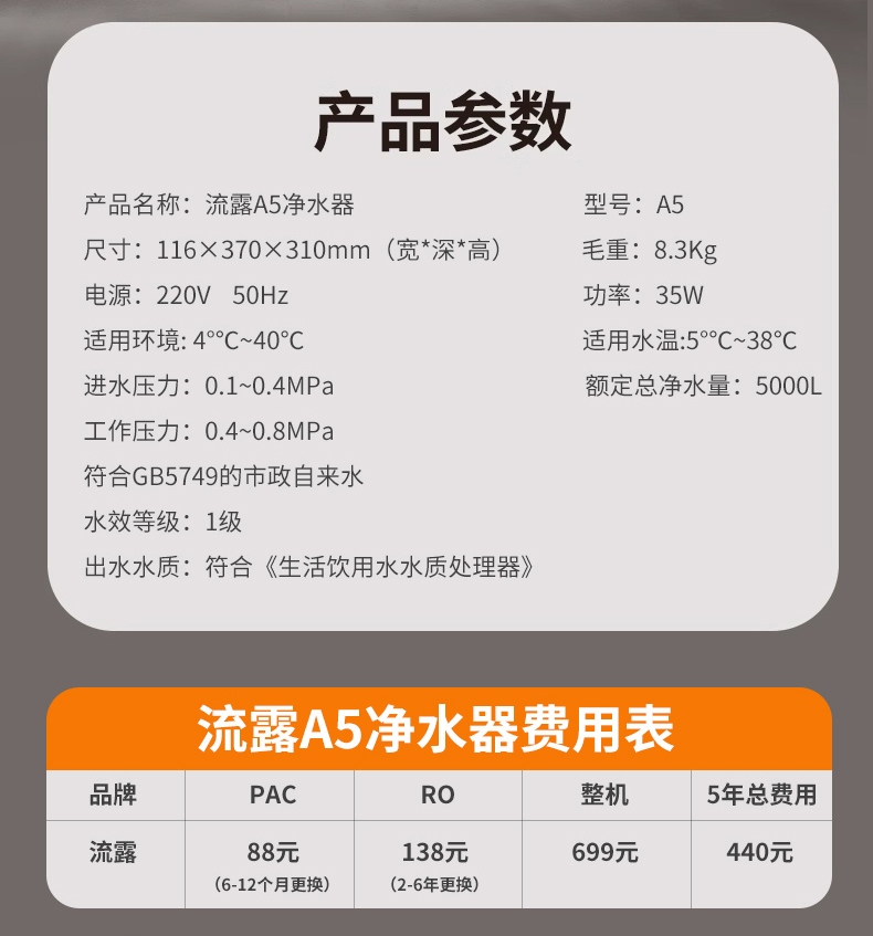 流露A5家用凈水器無阻垢劑699元